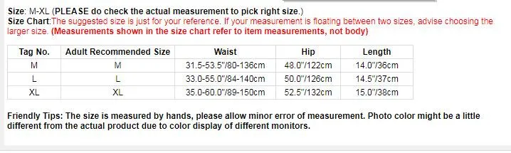 Size Chart:The suggested size is just for your reference. If your measurement is floating between two sizes, advise choosing the larger size. (Measurements shown in the size chart refer to item measurements, not body)