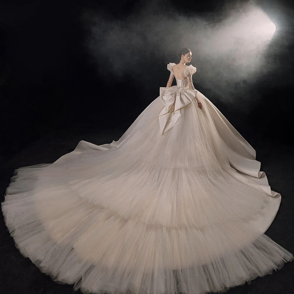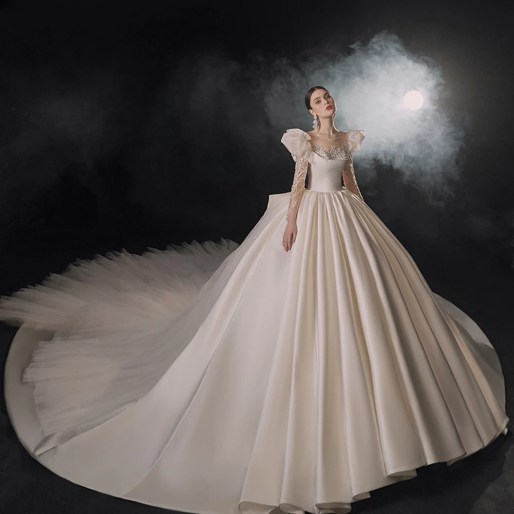 Jancember Superfine Factory Wholesale Wedding Dresses For Women Satin Full Sleeves O-Neck Bow Pleat Robe Mariage LSMX068