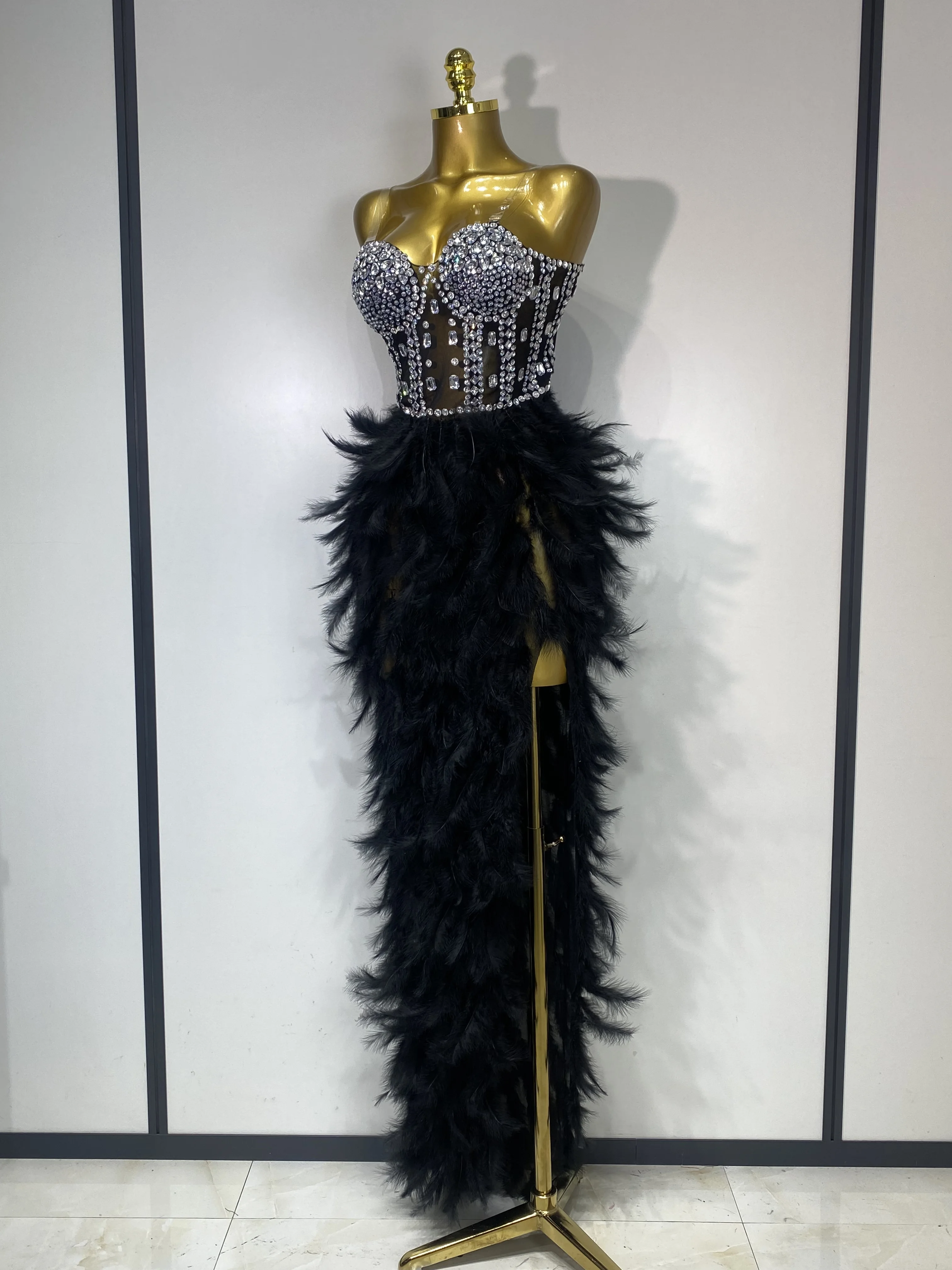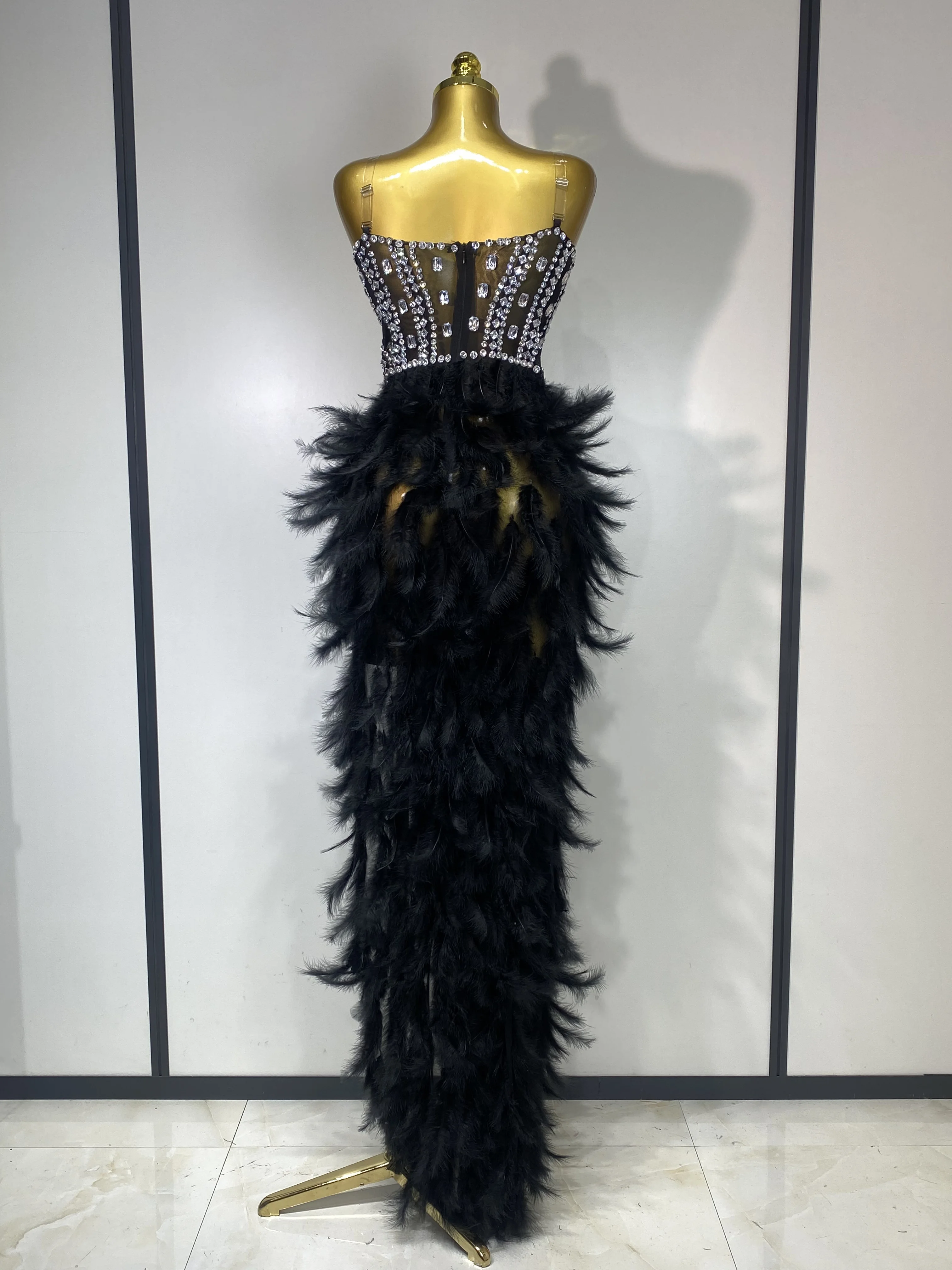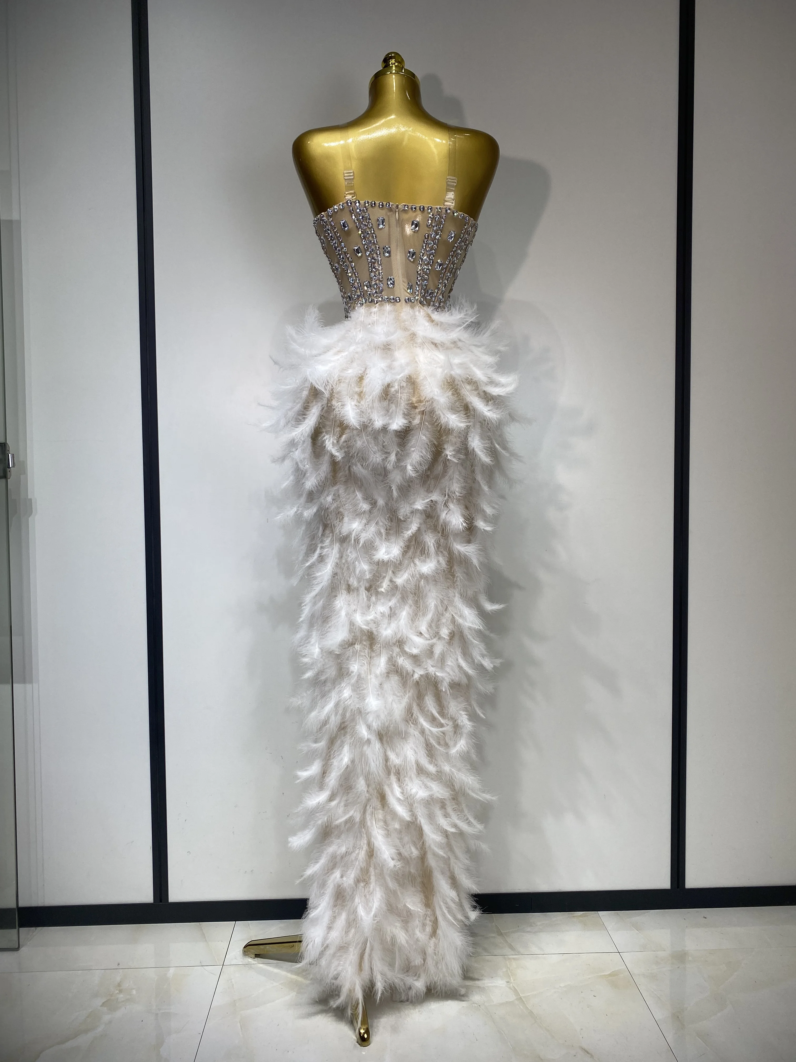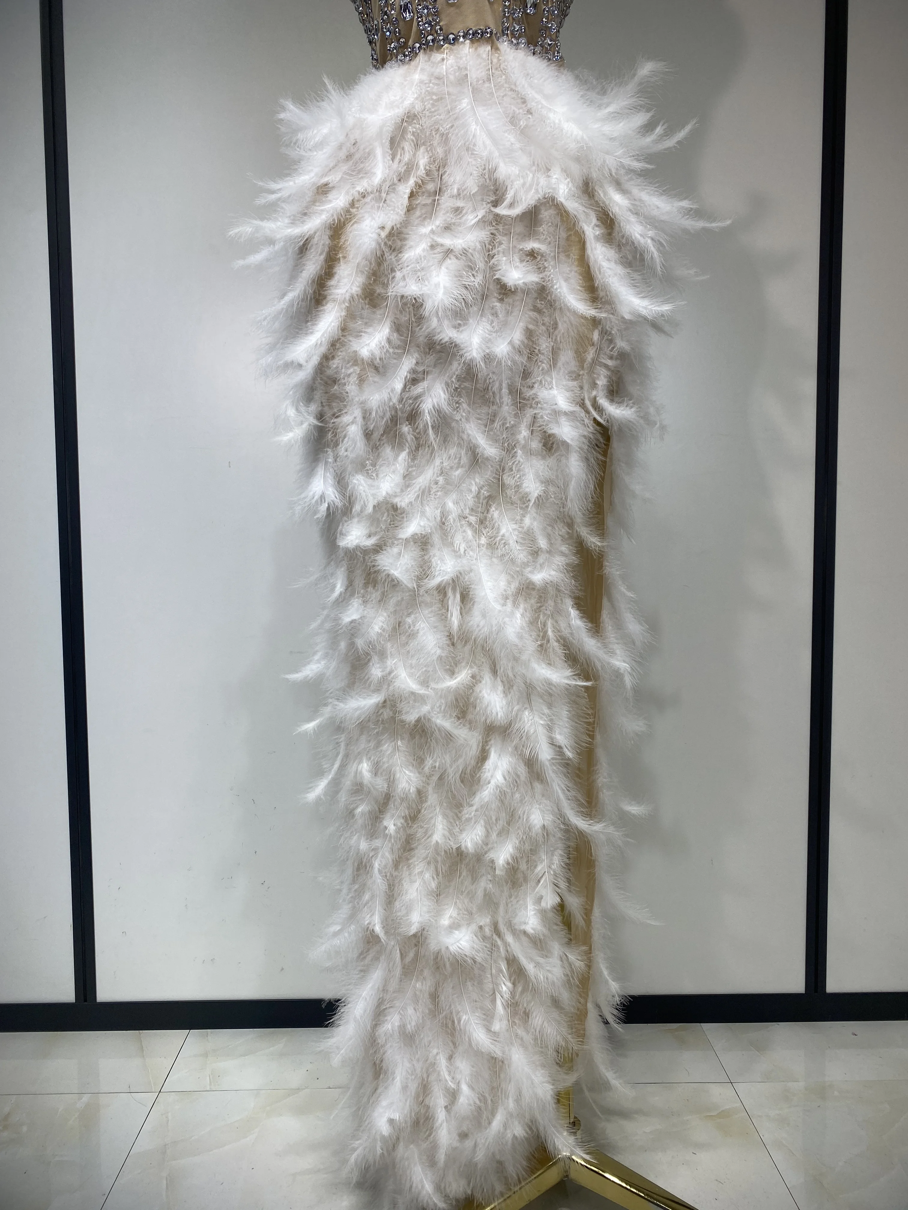 QueenLine Sexy Elegant Luxury Celebrity Sparkly Rhinestone Feather Mesh Long Dress