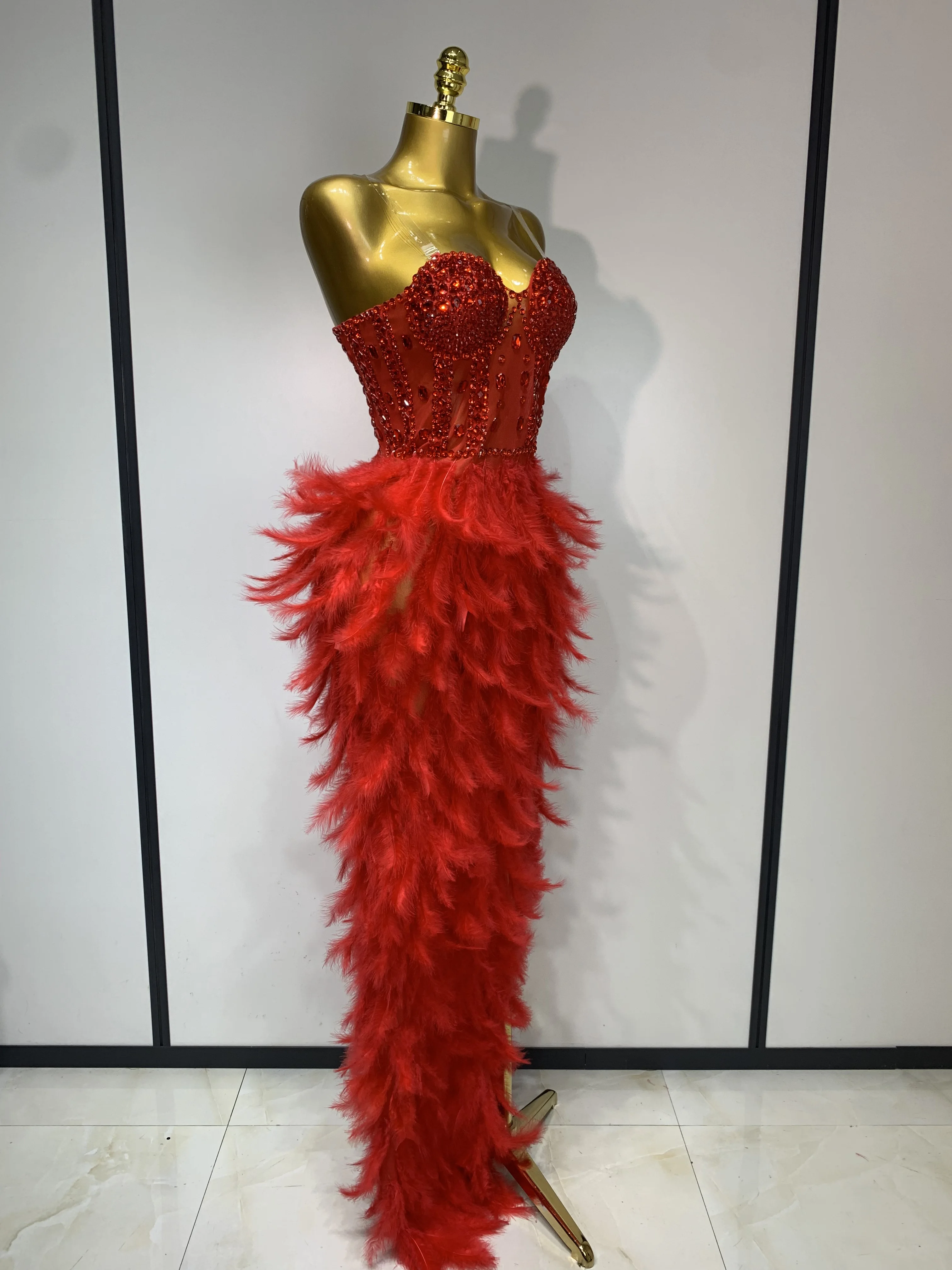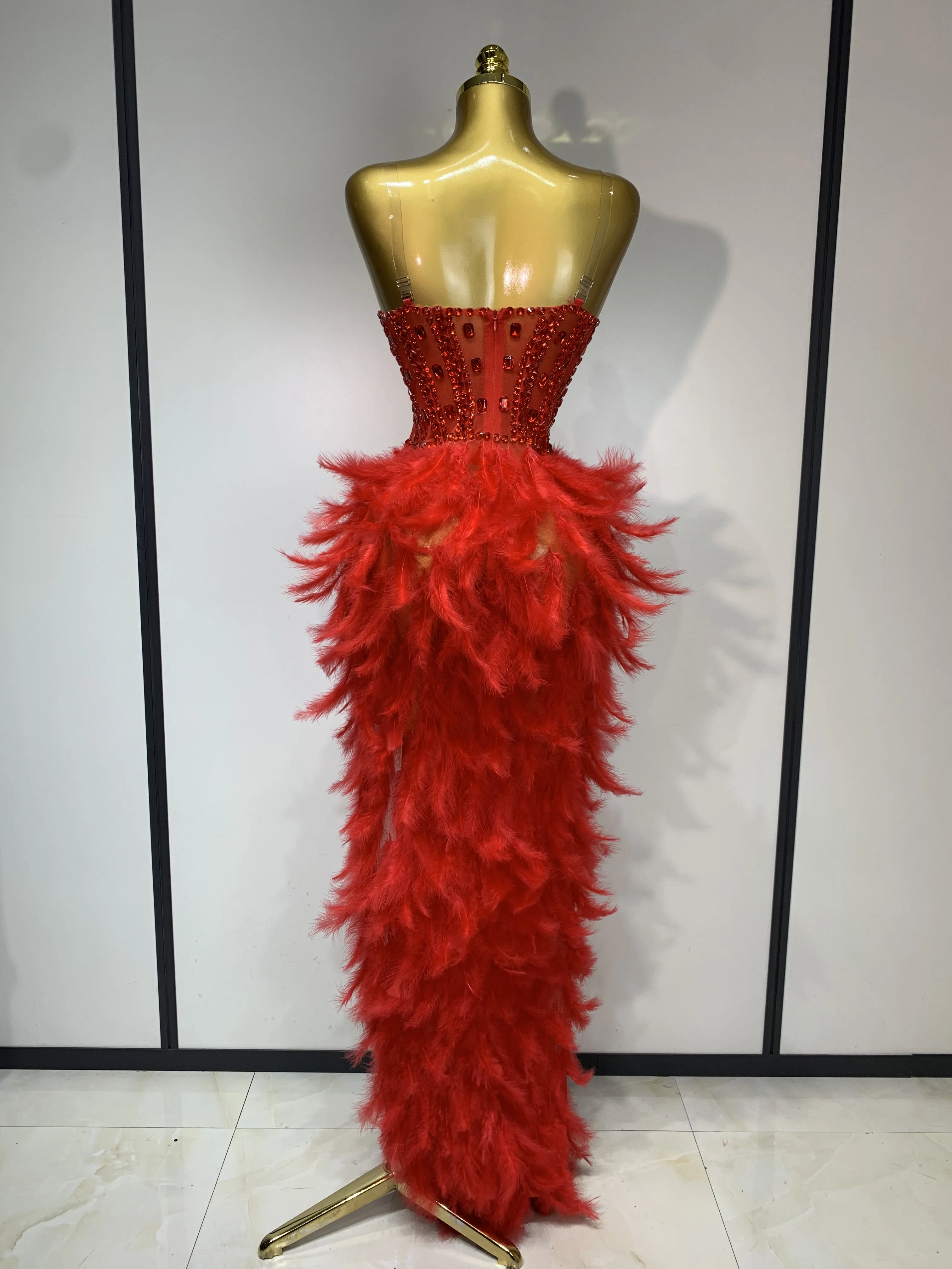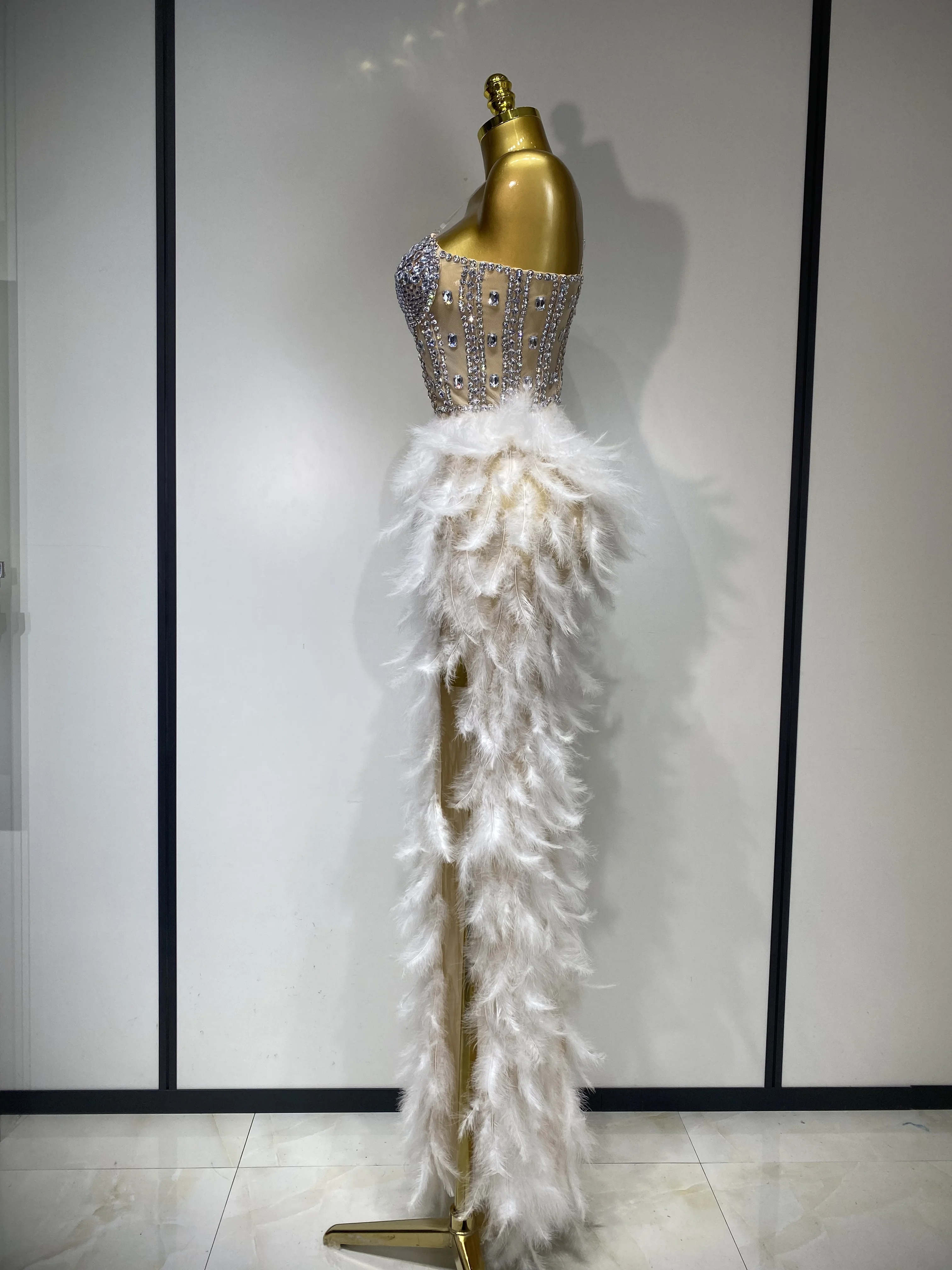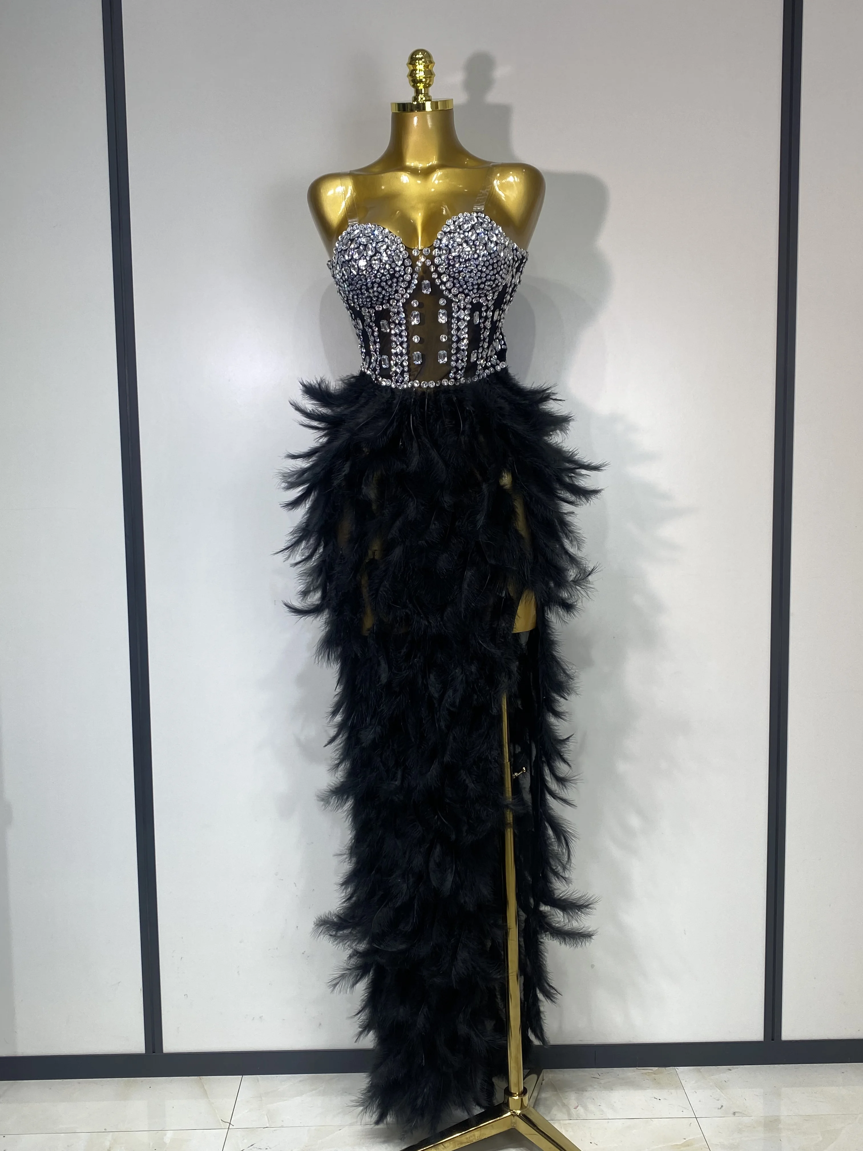 QueenLine Sexy Elegant Luxury Celebrity Sparkly Rhinestone Feather Mesh Long Dress