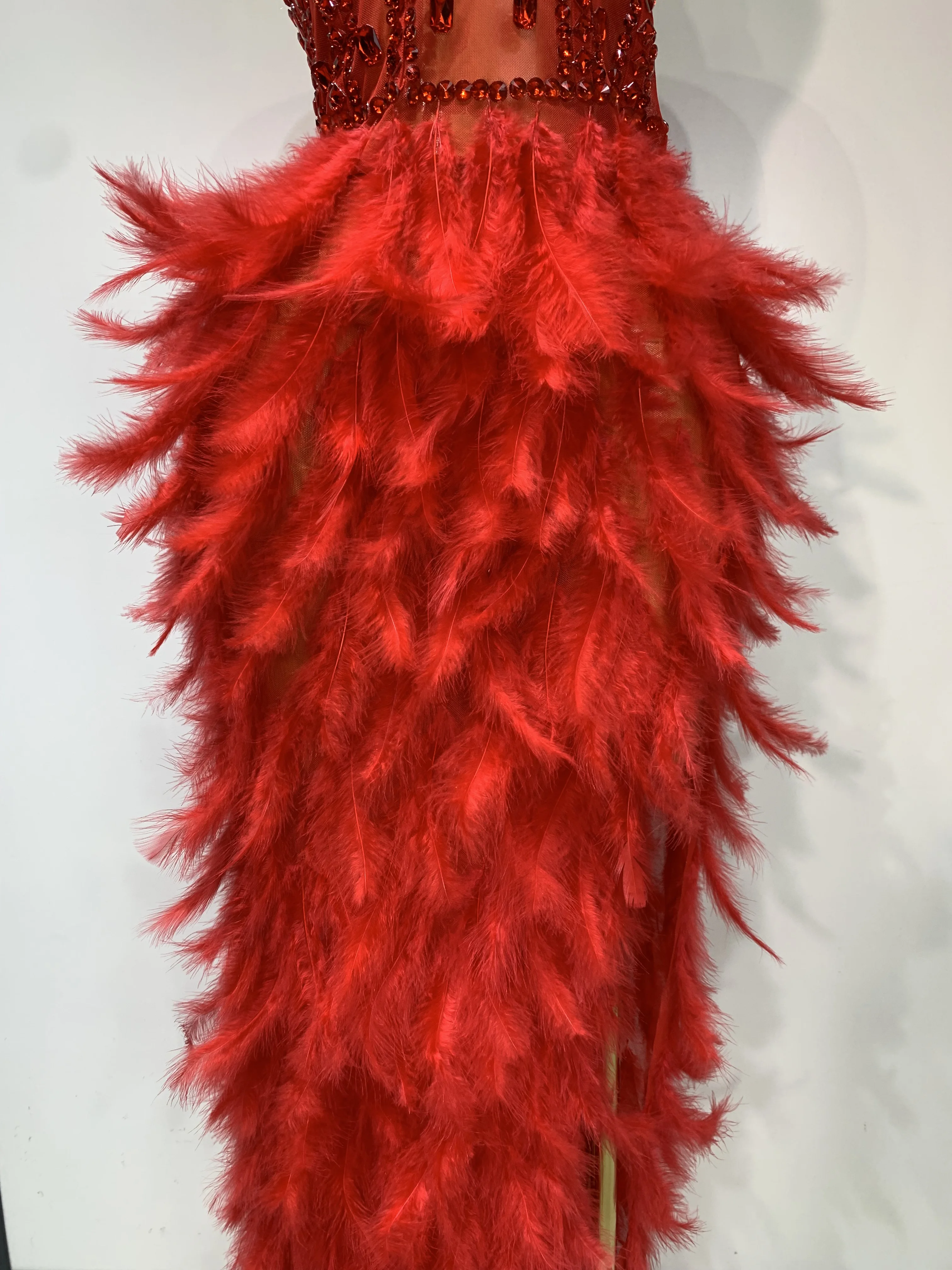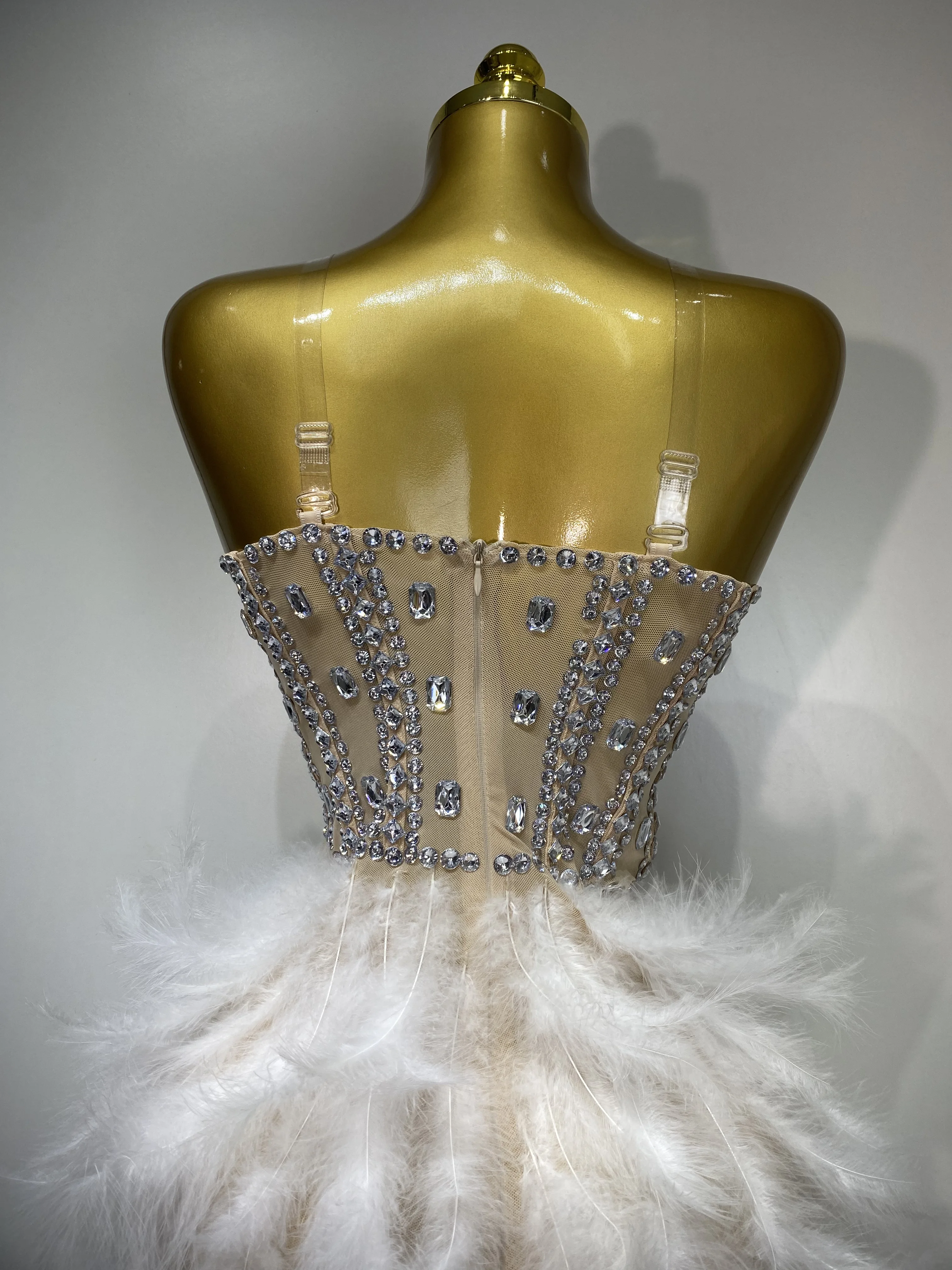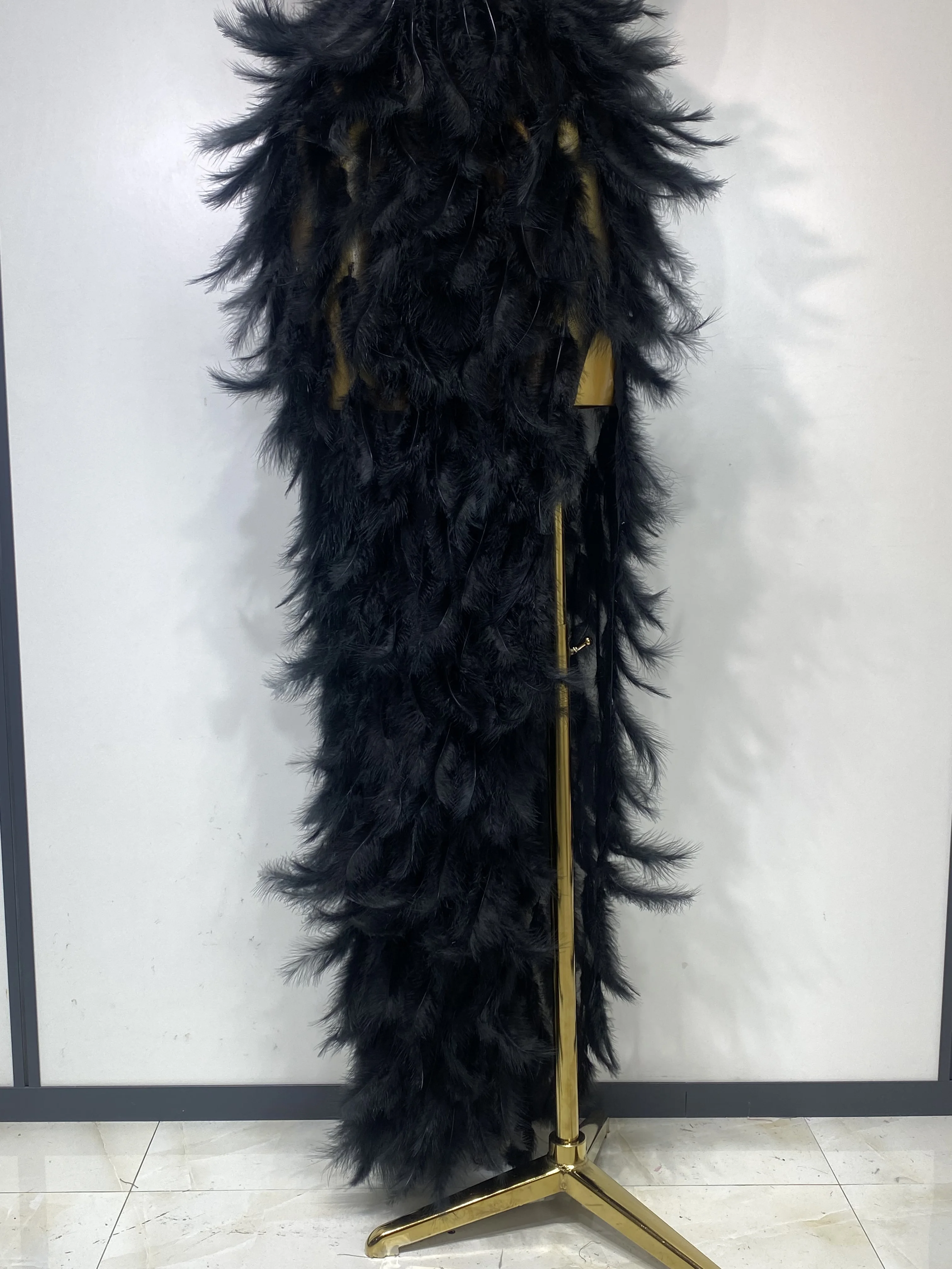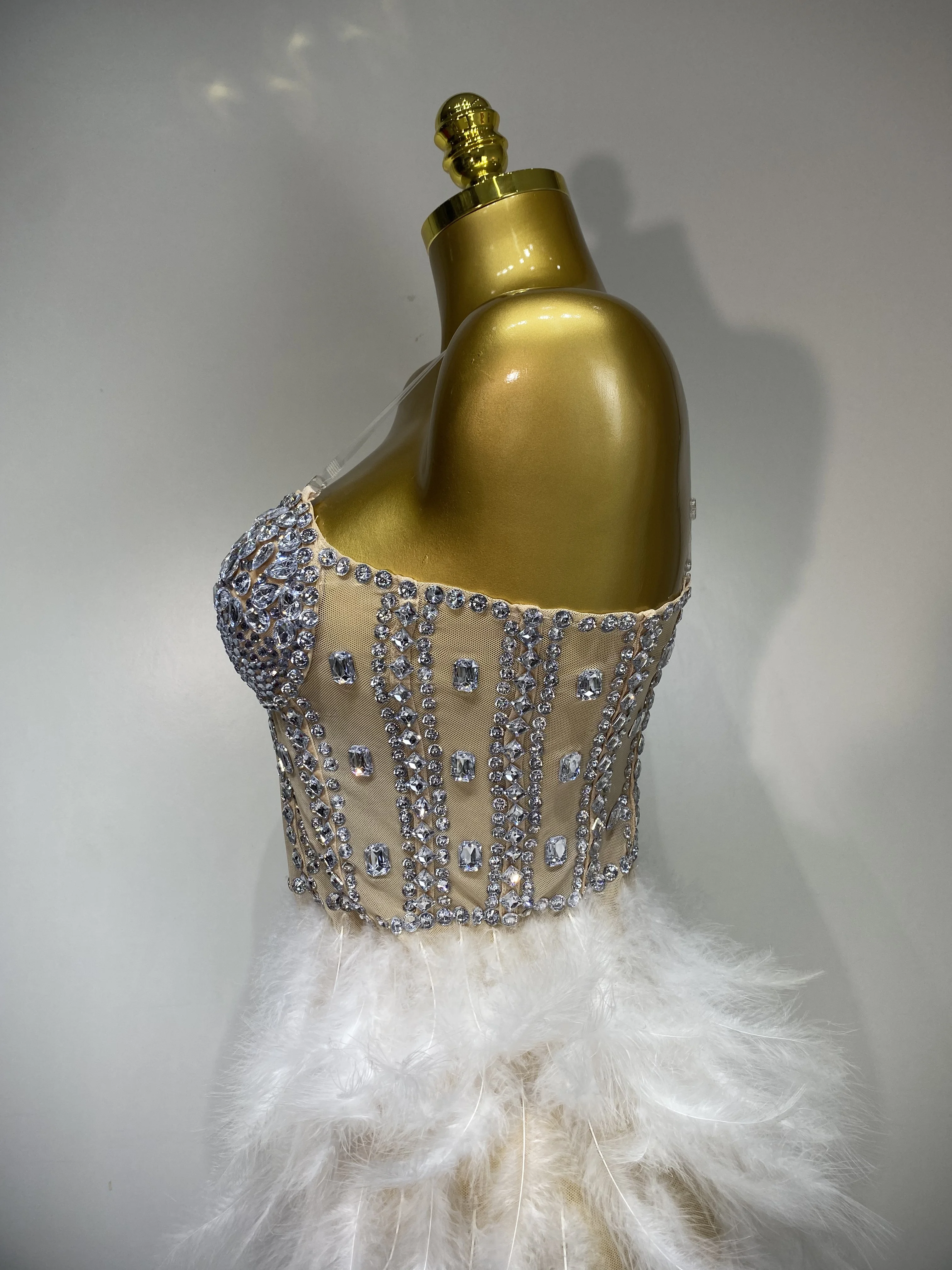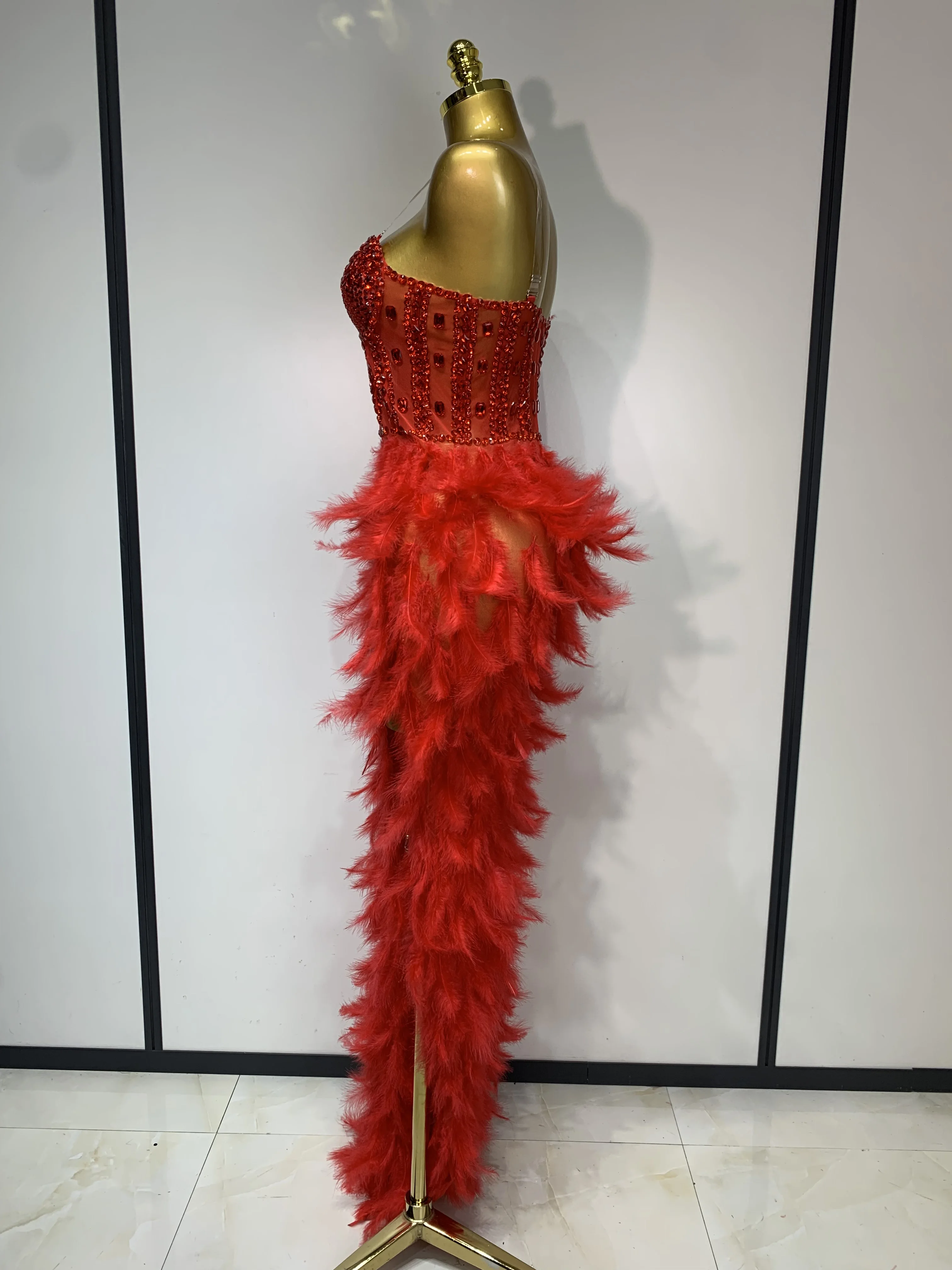 QueenLine Sexy Elegant Luxury Celebrity Sparkly Rhinestone Feather Mesh Long Dress
