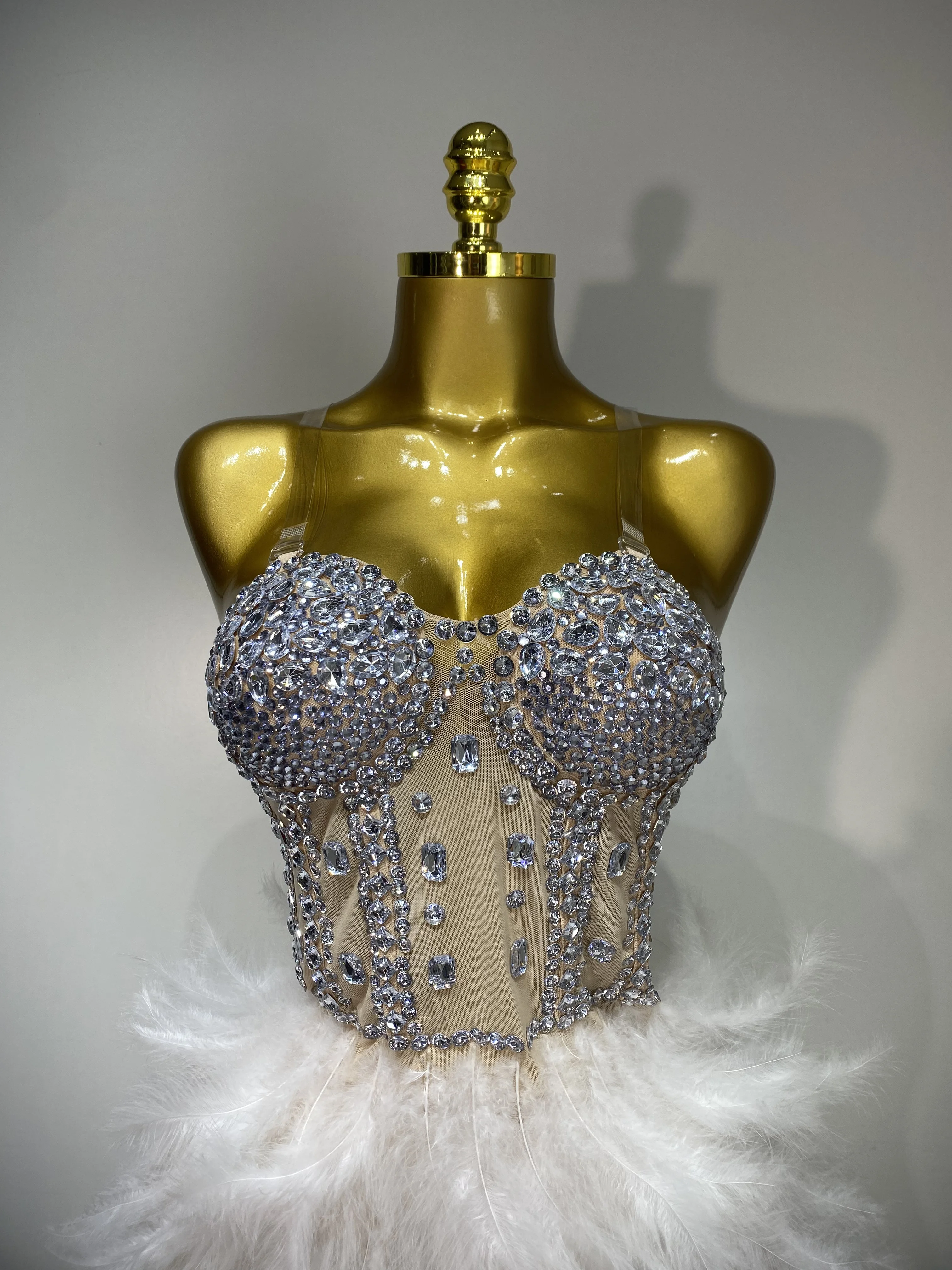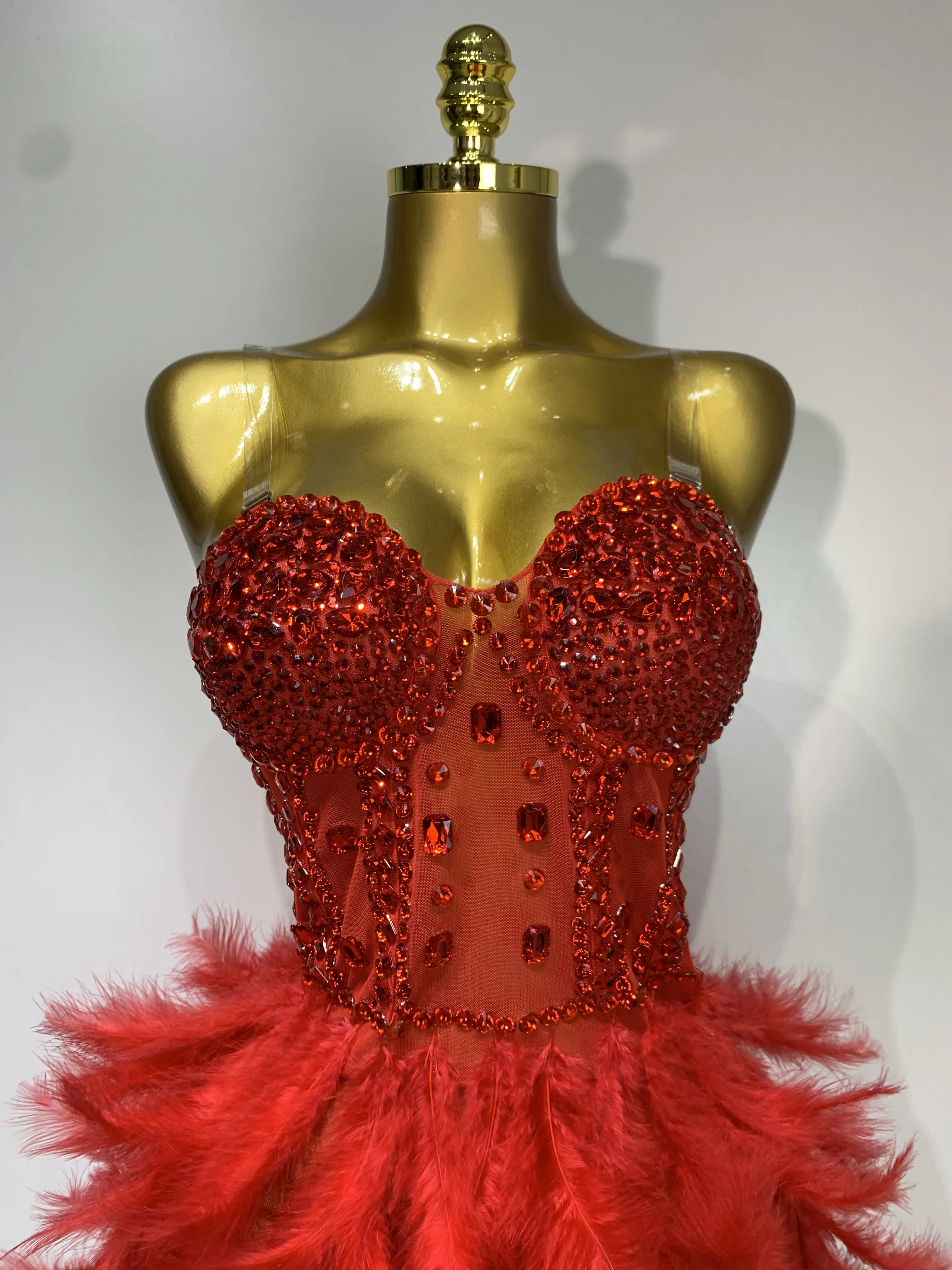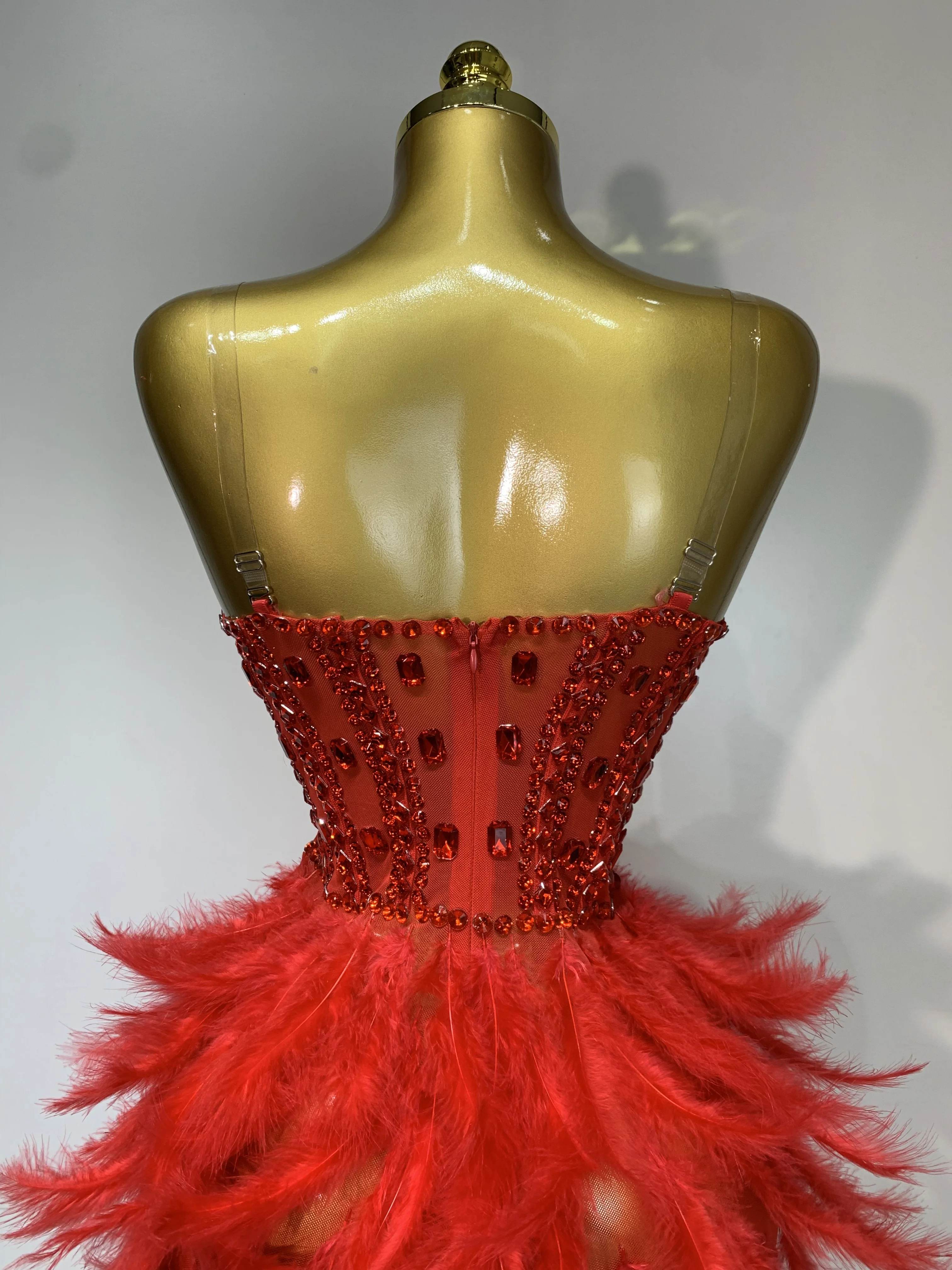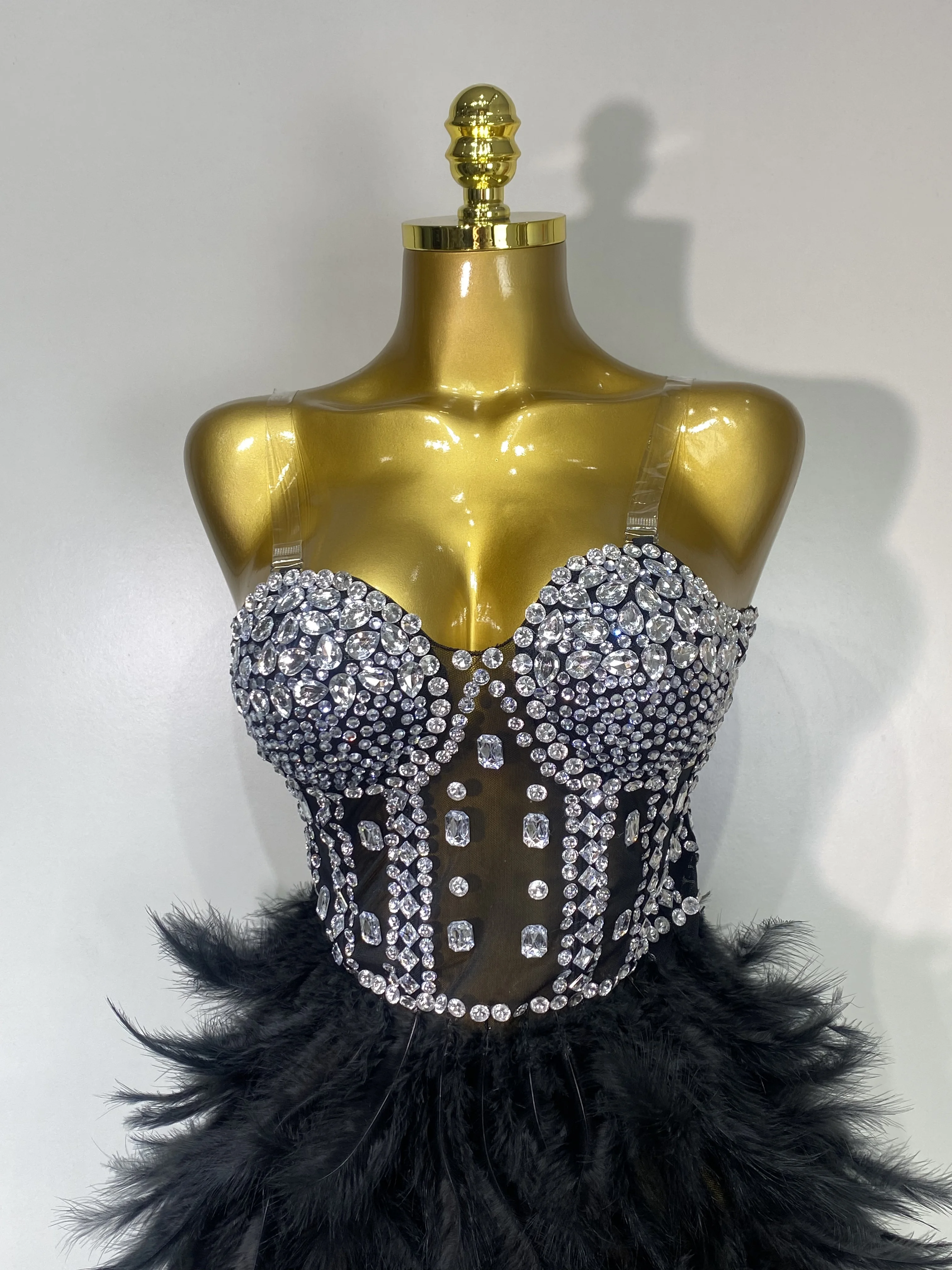 QueenLine Sexy Elegant Luxury Celebrity Sparkly Rhinestone Feather Mesh Long Dress