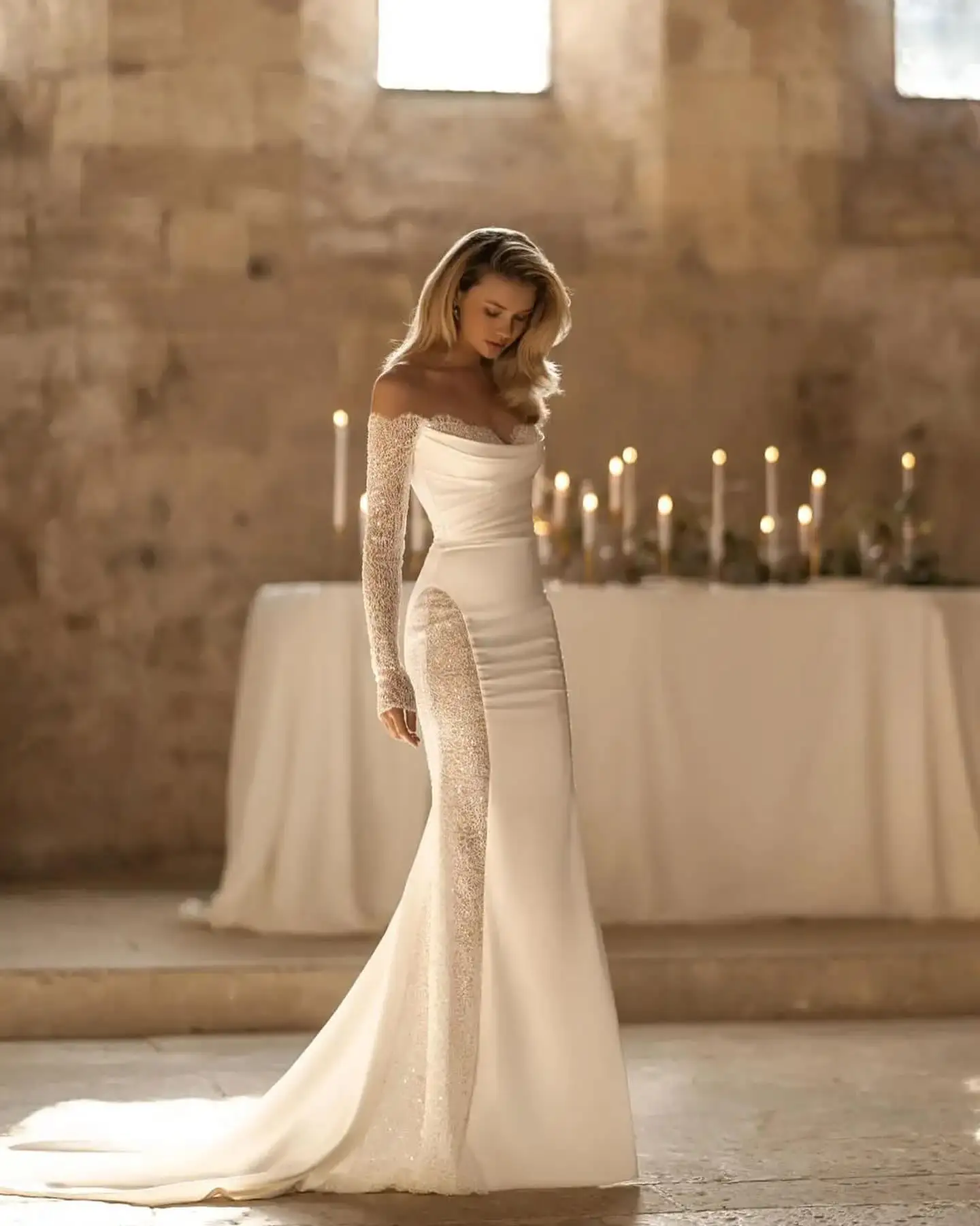QueenLine Sexy Long Sleeves Beaded Sweetheart Mermaid Sweep Train Custom Made Wedding Dress