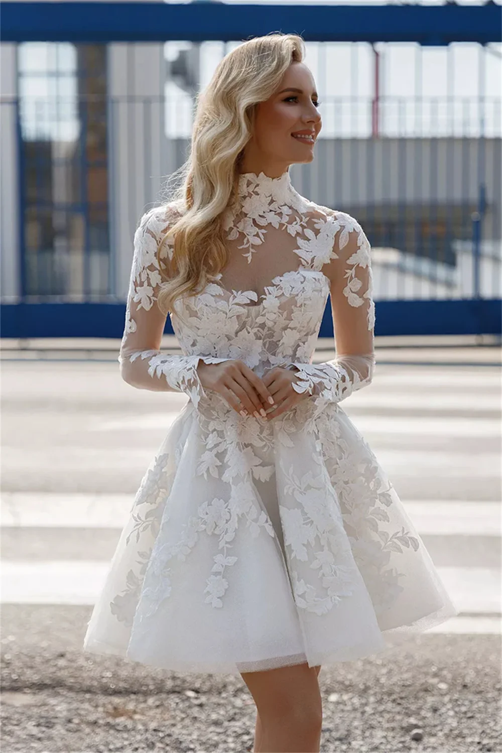 QueenLine Sheer Illusion High Neck Full Sleeves Lace Applique Custom Made Short Wedding Dress