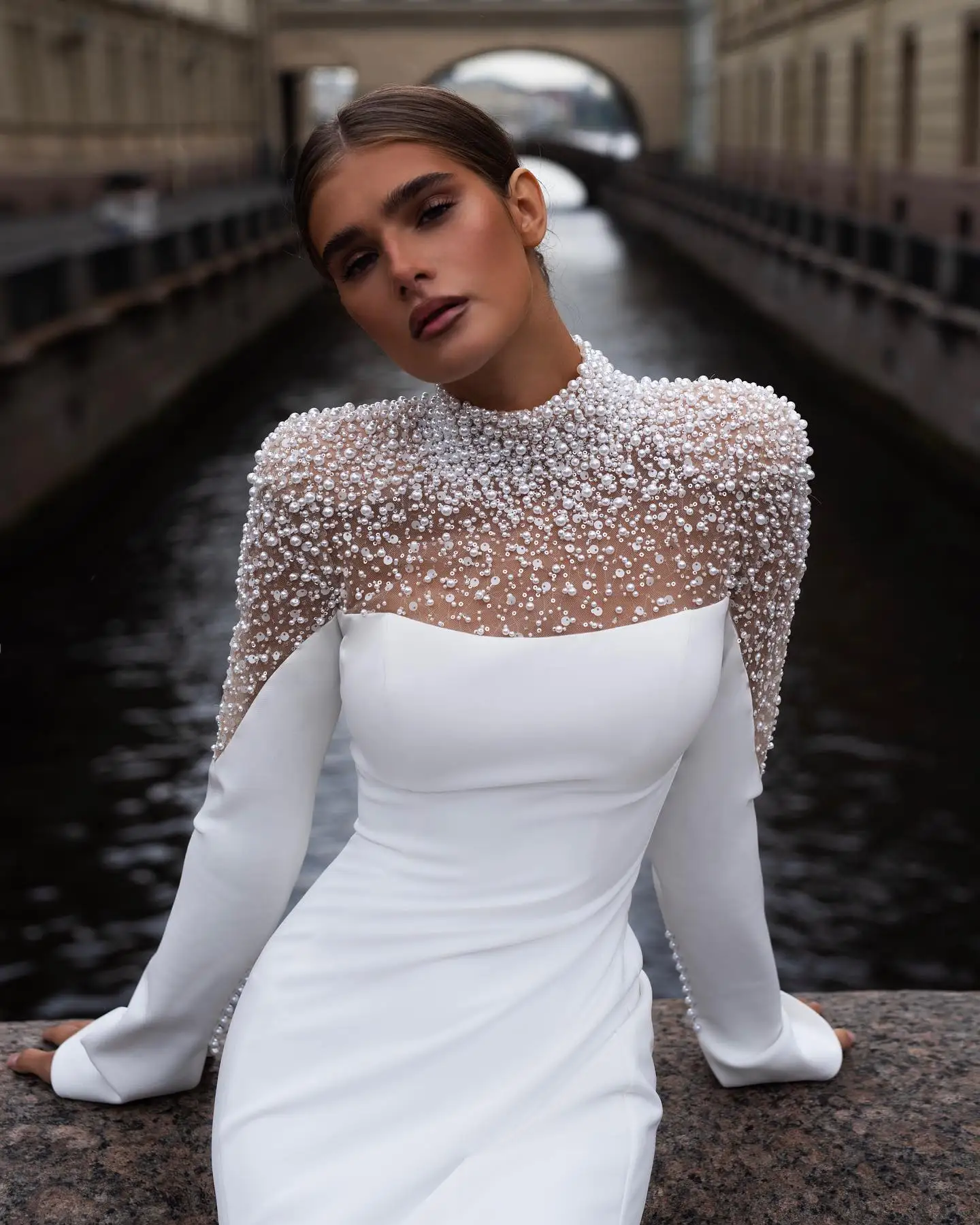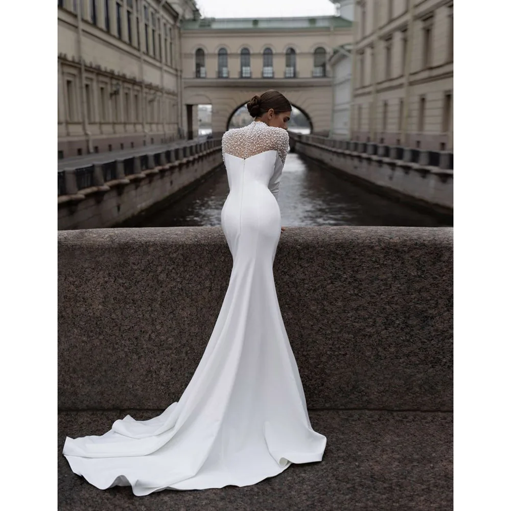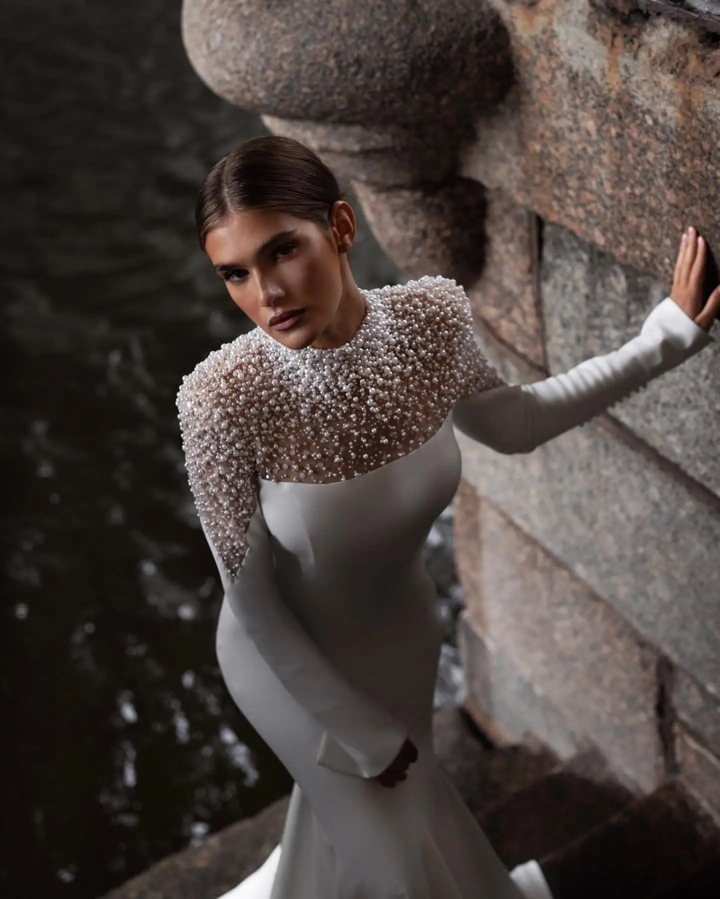 QueenLine Stunning High Neck Full Sleeves Peal Beaded Mermaid Sweep Train Custom Made Wedding Dress