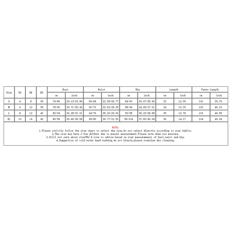 S = US4 = UK8 = EU36 (cm / inch) Bust: 74-86 / 29.13-33.86, Waist: 56-68 / 22.05-26.77, Hip: 84-90 / 33.07-35.43, Length: 33 / 12.99, Pants Length: 101 / 39.76