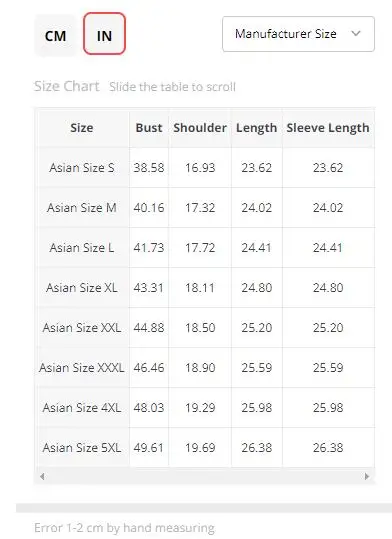 All measurements above are actual garment measurements. For a good fit,please add 10cm~12cm to your body chest measurement when selecting your size from the table above. Please ensure you measure yourself correctly before selecting your size to avoid errors.