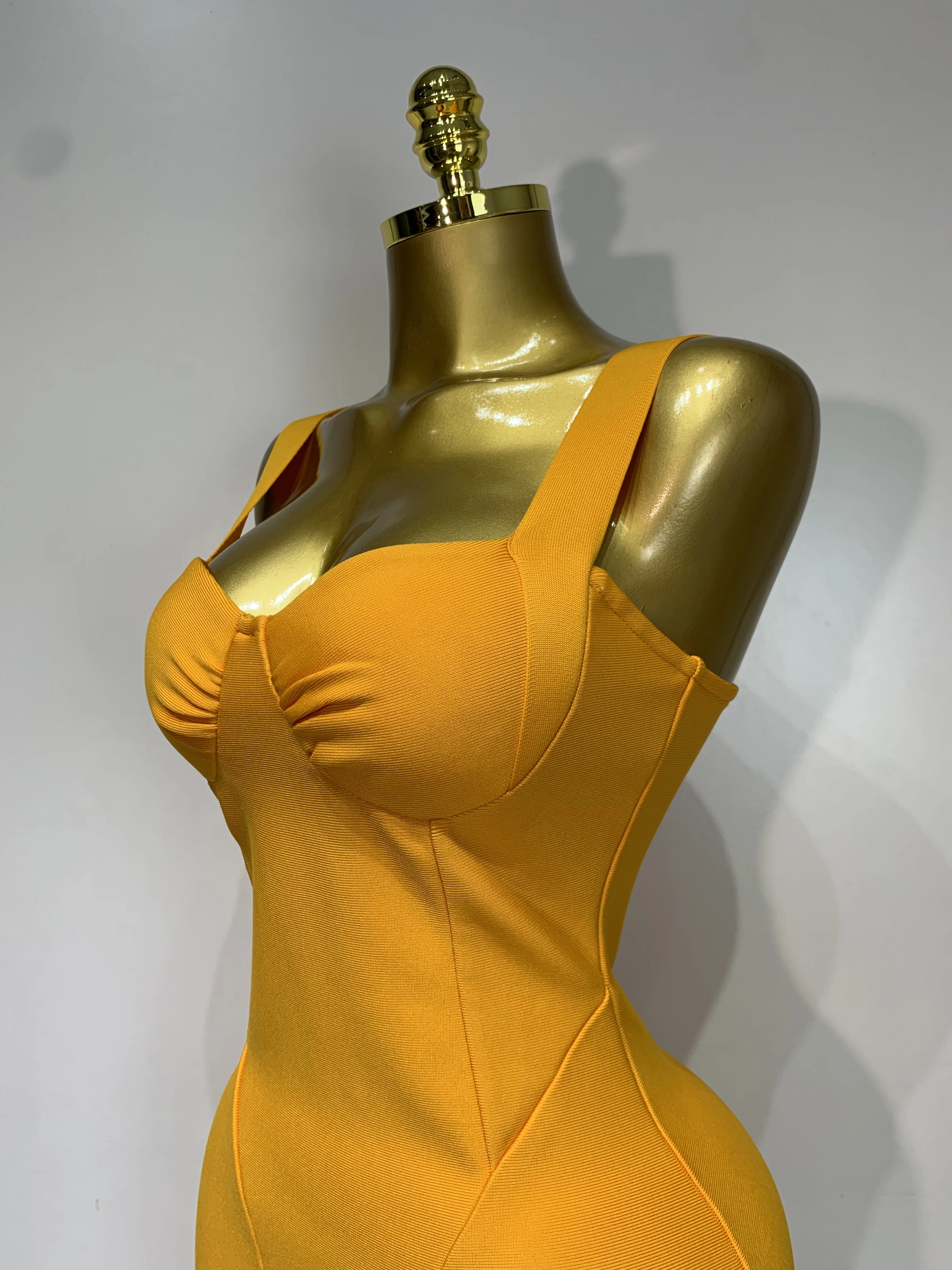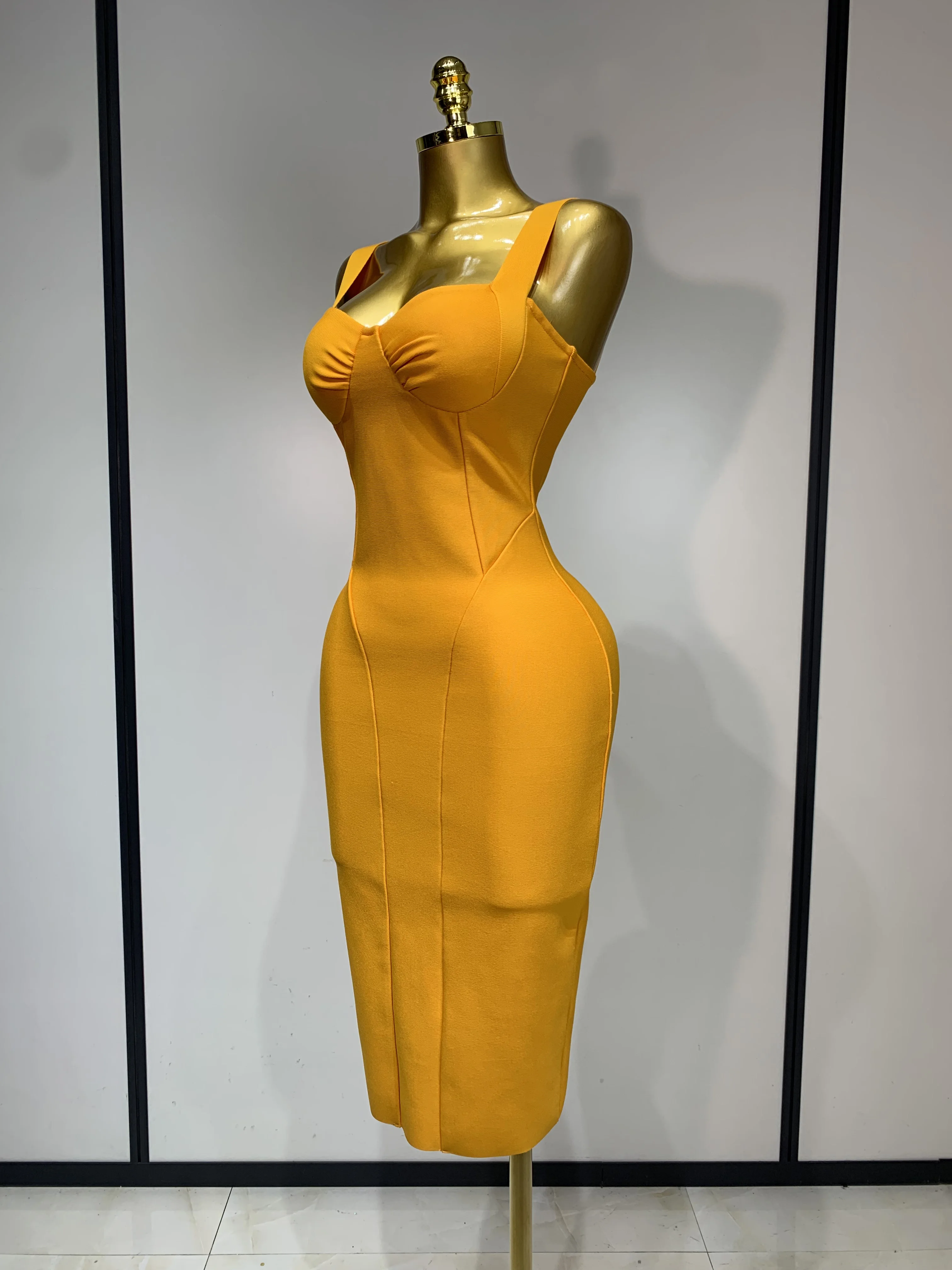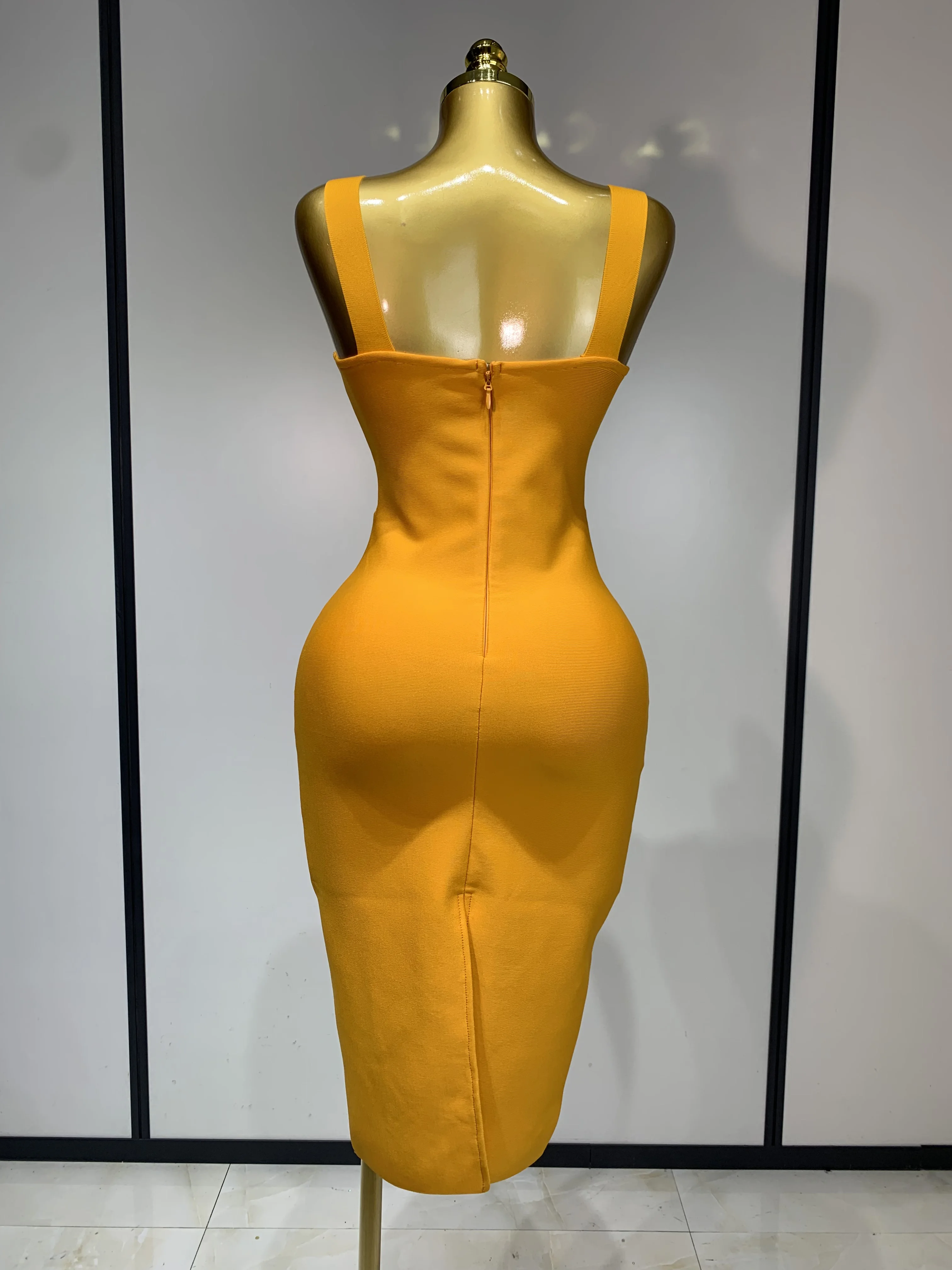 QuenLine Luxury Elegant Celebrity Sexy Orange Sleeveless Bodycon Bandage Evening Dress